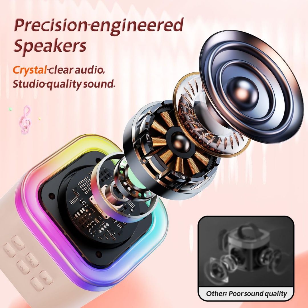 Multi-function Karaoke Machine - Equipped with 4 magical sound effects, providing endless fun for children. The LED lights dance to the rhythm of the music, creating a joyful atmosphere. It features a headphone output interface on the back, making it perfect for singing practice and family karaoke sessions. Internal vocal removal function so you can sing to your favorite songs! And its compact size makes it easy to carry when traveling.<br><br>
