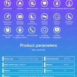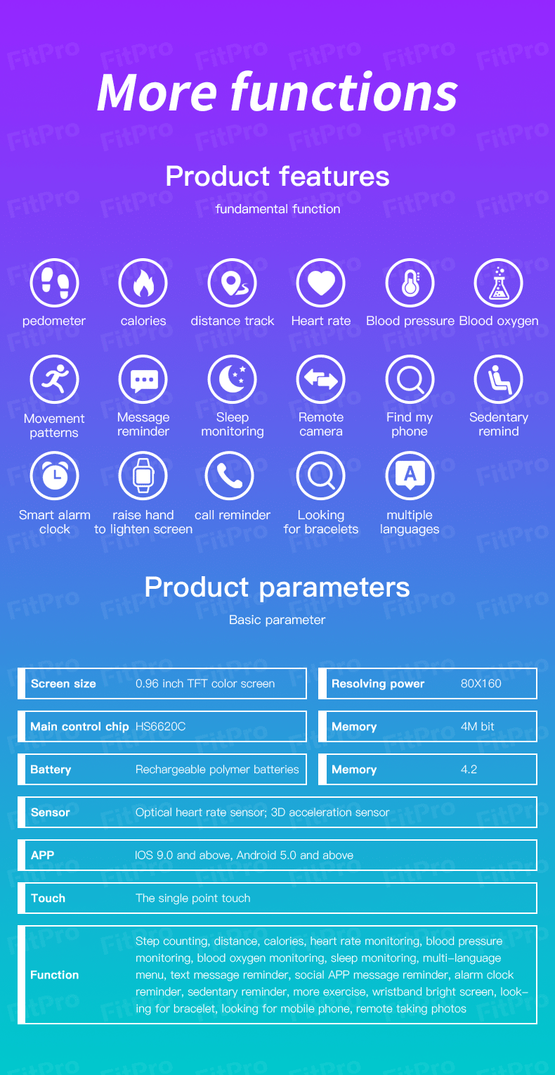 Deportes y Salud: sincronización de información; calidad de sueño; pasos; distancia; calorías; IP65 a prueba de polvo e impermeable; multilenguaje; control de la cámara del teléfono.