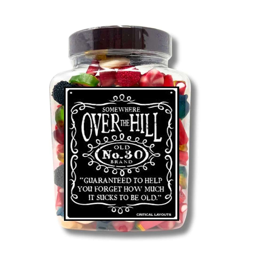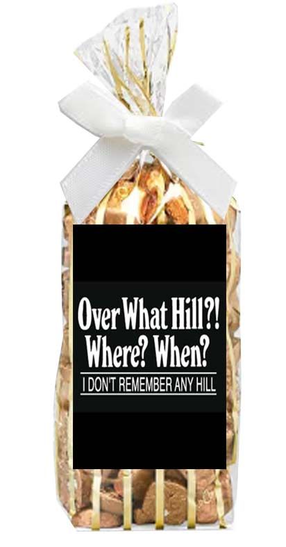 That over-the-hill birthday will be lots of fun when the Over The Hill gift basket arrives. A tombstone towers over cookies, "over the hill" pills, and "over the hill" mug, lots of goodies as well as the Victims Guide to Birthdays book. Don't miss the "over the hill" hearing aid so they can hear you sing Happy Birthday! Send the Over the Hill gift basket to your favorite "senior citizen".The Large Over the Hill Birthday Gift Basket includes: 6"Over the Hill Tombstone, Over the Hill Fortune Cookies, Over the Hill Pills, Over the Hill Mug, Ms Beasley's Chocolate chip cookies, 5 oz. Chocolate Fudge Popcorn, 5 oz Grand Party Mix, Over the Hill Theme Bag with Candies, Over The Hill Pork & Beans Can for Regularity , Victims Guide to Birthdays, Over the Hill Hearing Aide, Petite Fruit Candies, 1.5 oz. White Cheddar Popcorn, Assorted Sour Balls, Black Oval TrayPrice includes Ground Shipping