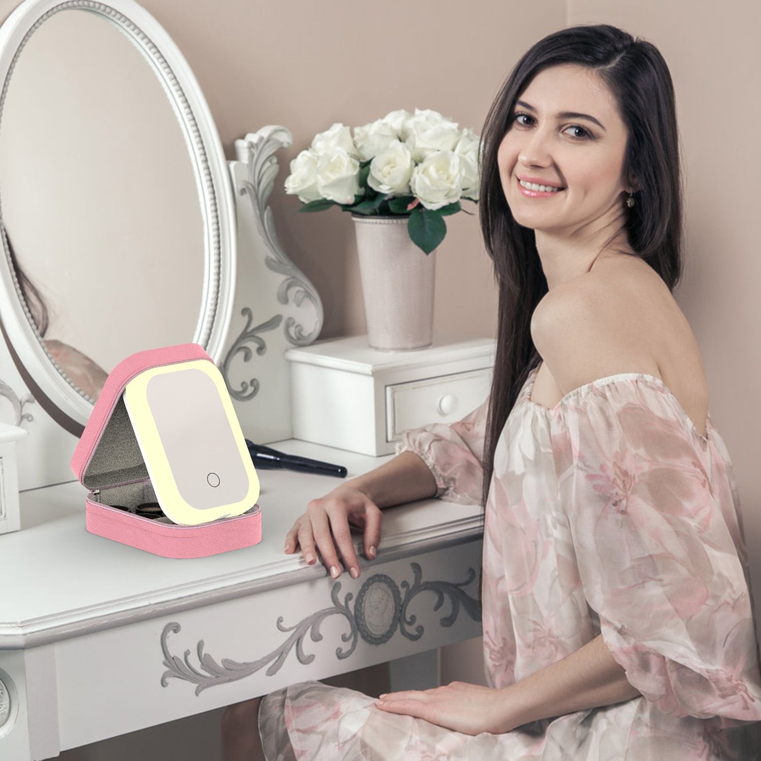 Portable Travel Makeup Bag With LED Mirror Rechargeable Beauty Mirror With 3 Color Light Dimmable Brightness Waterproof Cosmetic Bag With 4 Compartments Ideal Gift For Women